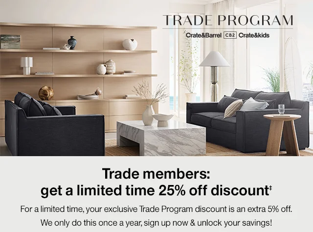 This special 25% discount is valid for eligible Trade Program Members January 15–February 12, 2025, and is good toward full-price merchandise purchases at U.S. Crate & Barrel and CB2 stores (excluding Outlets), websites (including Crate & Kids) and phone orders. Some product exclusions apply. Discount may not be used at any Crate & Barrel or CB2 stores, websites or phone orders outside the U.S., or at Hudson Grace stores, website or phone orders. Discount is non-negotiable. Purchases made by any other person are not eligible for the discount. Discount is to be used for business purposes only. Using the discount for personal purchases is a violation of the Terms and Conditions at crateandbarrel.com/trade-program and cb2.com/trade-program. Discount is not