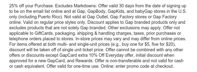 25% off your purchase. Excludes markdowns