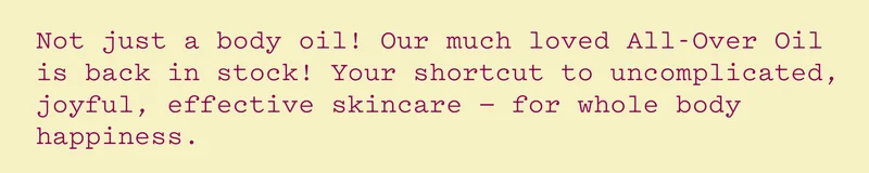 - Our much loved All-Over Oil is back in stock.
