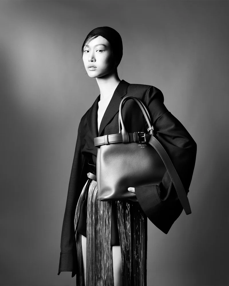 The new Prada Buckle bag, presented during the SS24 fashion show, features iconic references from the brand’s lexicon, such as the belt detail that outlines the upper profile and allows for various customizations. |