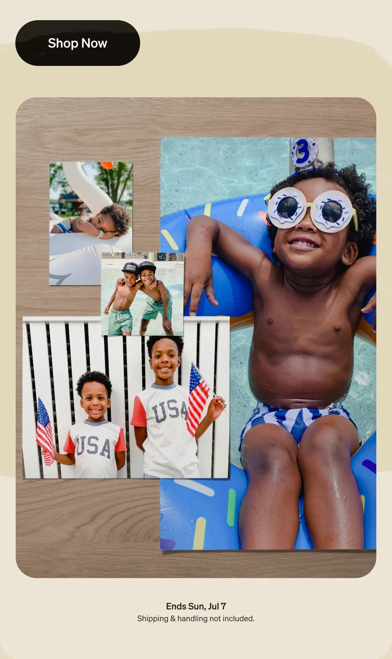 or the Shutterfly app. Free product offers cannot be combined with free shipping. Taxes, shipping and processing may apply. Not valid on other print sizes/finish, other products, prepaid or annual savings plans, other products, prior purchases and orders placed for in-store pick up. Offer cannot be combined with other code-based $-off offers. Promo can only be redeemed once per account and/or billing address. Code can only be entered once. Not valid for resale. Offer cannot be redeemed for cash or cash equivalent. Cannot be combined with select offers or credits. Shutterfly may modify or replace any part of these terms and conditions without notice at any time. Shutterfly may refuse or cancel orders due to promo and pricing errors, fraud, misuse, or unauthorized use. Valid while