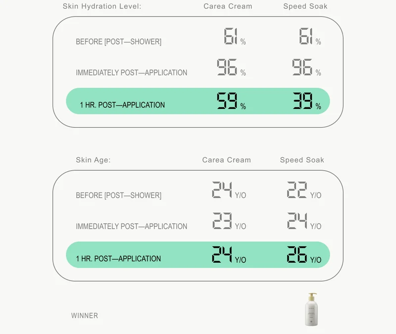 To keep it fair, I tested one formula per arm. Measured after showering, both arms started out at a 61% hydration level. For some reason, the arm I assigned to Speed Soak was spiritually 22, and Carea Cream a slightly wiser (debatable) 24. Moving on…