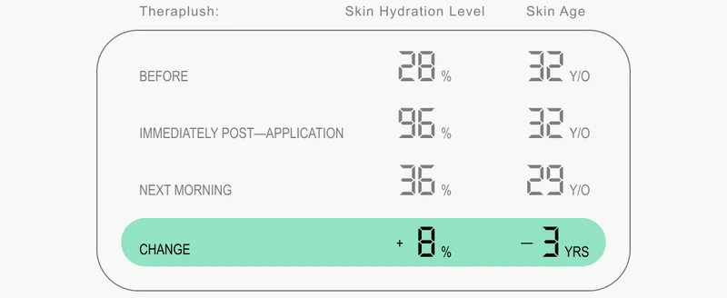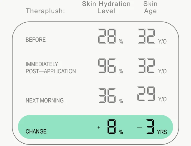I got the corneometer involved in my nightly Theraplush ritual. I washed my hands, got into bed, and measured my hands’ hydration (28%) and age (32). I rescanned a couple of minutes after applying Theraplush; while age remained the same, hydration skyrocketed to 96%. Phew.