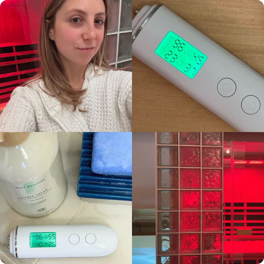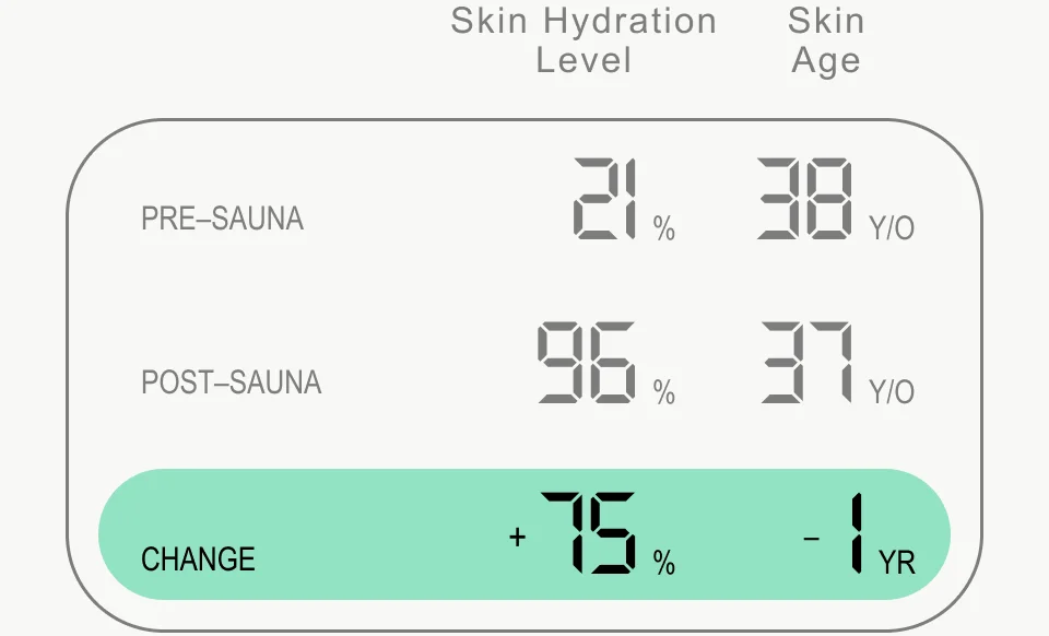 | I’ll take any opportunity I can get to lurk around Sky Ting—my local yoga/sauna studio—so hydration testing felt like the perfect excuse to pay a visit to their sauna. After stripping down to my sauna uniform, I gave myself a good old probe, revealing my skin’s age to be 38 years old with a 21% hydration level. Brutal. Fast forward through 30 minutes of reading and daydreaming about redesigning my apartment to be a replica of this space, my skin emerged a year younger and 75% more hydrated. You heard it here first, folks: sweating is good for you. |
