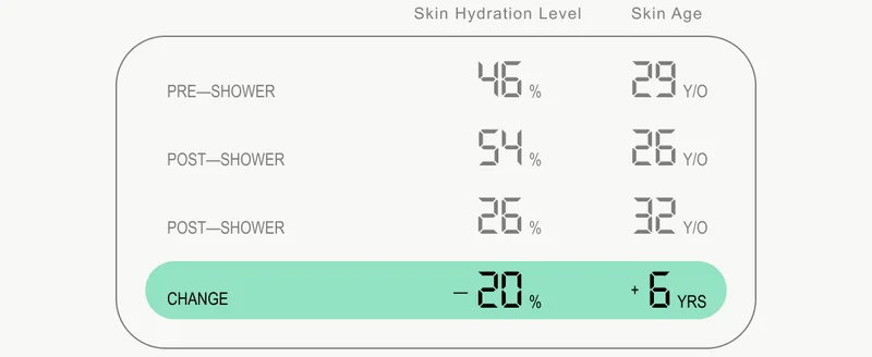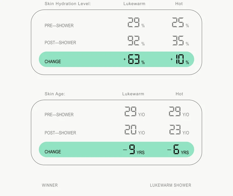 Here’s where it gets interesting. The lukewarm shower brought my skin from 29 years old to 20 years old, improving its hydration percentage from 29% to a whopping 92%. The (almost boiling) hot shower, on the other hand, brought my skin’s age down by six years, and only increased its hydration by 10%. Even so, I make no promises that I’ll be able to shower with only lukewarm water going forward... |