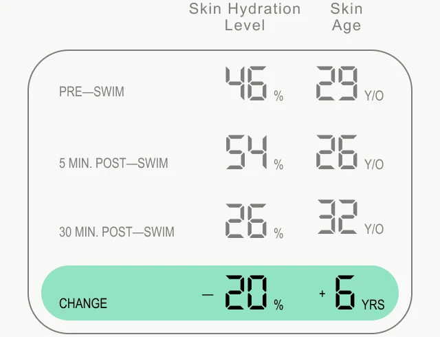 Interestingly, my skin’s water content increased by 8% immediately after getting out of the pool. However, when I tested it again 30 minutes later, it dropped down to 28%. My skin’s age remained solid at 26 pre- and immediately post, but an extra 30 minutes brought me to the skin of a 32 year old. Shame. |