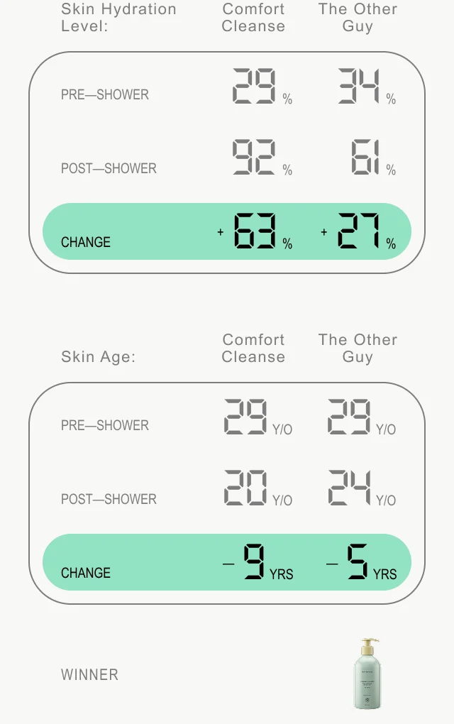 The first agenda item: body wash. I tested my skin’s hydration percentage before and after cleansing with two different products, Comfort Cleanse and what we’ll refer to as The Other Guy.